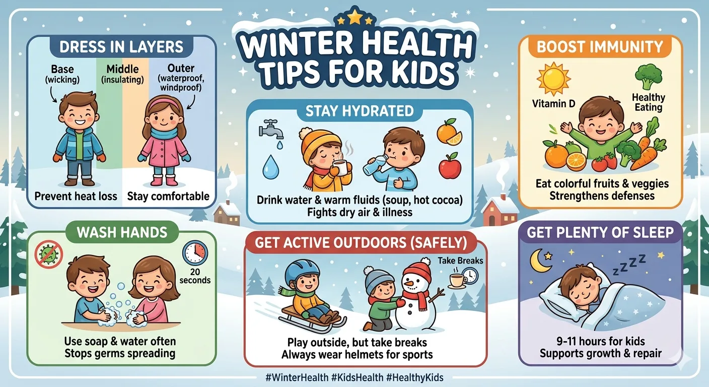 The core principles are straightforward. Dress children in proper layers and check their skin regularly. Know the warning signs of frostbite and hypothermia before they become emergencies. Keep children hydrated with warm fluids throughout the day. Get the flu vaccine every year without exception. Apply sunscreen on snowy days just as you would in summer. Keep bodies moving with active indoor routines. And never overlook the importance of mental wellbeing during the darker, colder months.
