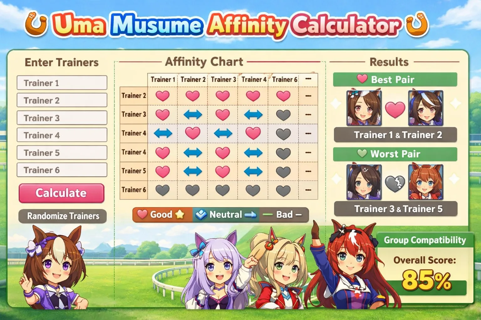 The Uma Musume community has produced a range of high-quality affinity calculator tools, primarily developed by dedicated fans in Japan and localized or adapted by international players. When looking for a reliable calculator, prioritize tools that: